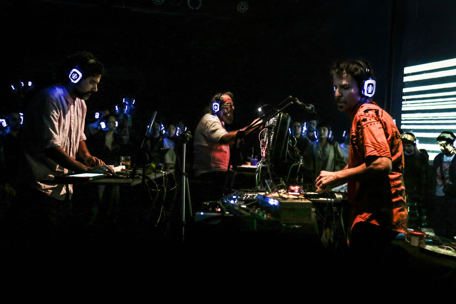 El público escucha a través de auriculares inalámbricos provistos en la sala que les permiten moverse por el espacio, bailar libres y lúdicamente.