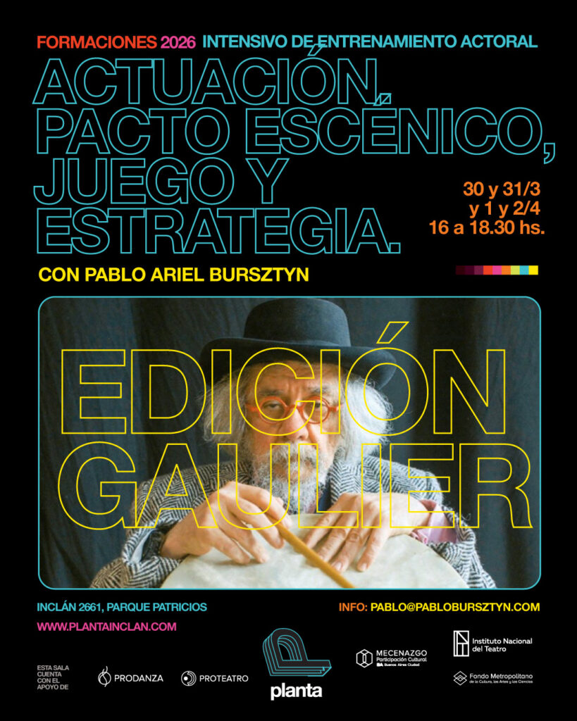 ACTUACIÓN. Pacto escénico, juego y estrategia EDICIÓN GAULIERIntensivo de entrenamiento actoralcon Pablo Ariel Bursztyn FECHAS:30 y 31/3 y 1 y 2/4 de 16 a 18.30hs info: [email protected] ACTUACIÓN. Pacto escénico, juego y estrategia EDICIÓN GAULIER Intensivo de entrenamiento actoral con Pablo Ariel Bursztyn fORMACIONES / Sala Física 30 y 31/3 y 1 y 2/4 de […]