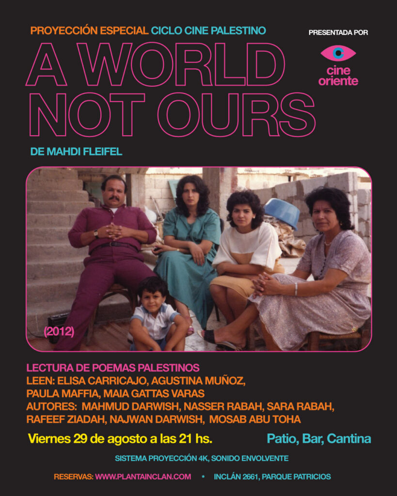 CINE ORIENTE – CICLO CINE PALESTINO – Agosto 2025 A WORLD NOT OURS (2012), de MAHDI FLEIFEL + ¨QUE EL LENGUAJE TE HAGA JUSTICIA¨ poesía palestina presentada por Inés Coppolechia LECTORAS: Elisa Carricajo, Agustina Muñoz, Paula Maffia, Maia Gattas Vargas. AUTORES: Mahmud Darwish, Nasser Rabah, Sara Rabah, Rafeef Ziadah, Najwan Darwish, Mosab Abu Toha VIERNES 29 […]