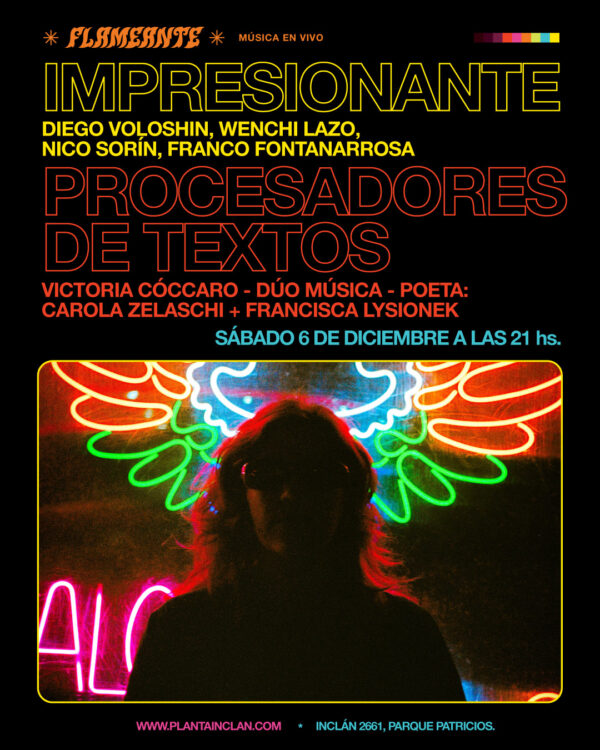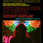IMPRESIONANTE (Diego Voloshin, Wenchi Lazo, Nico Sorín, Franco Fontanarrosa) + PROCESADORES DE TEXTOS (Victoria Cóccaro – Dúo música – poeta: Carola Zelaschi + Francisca Lysionek)